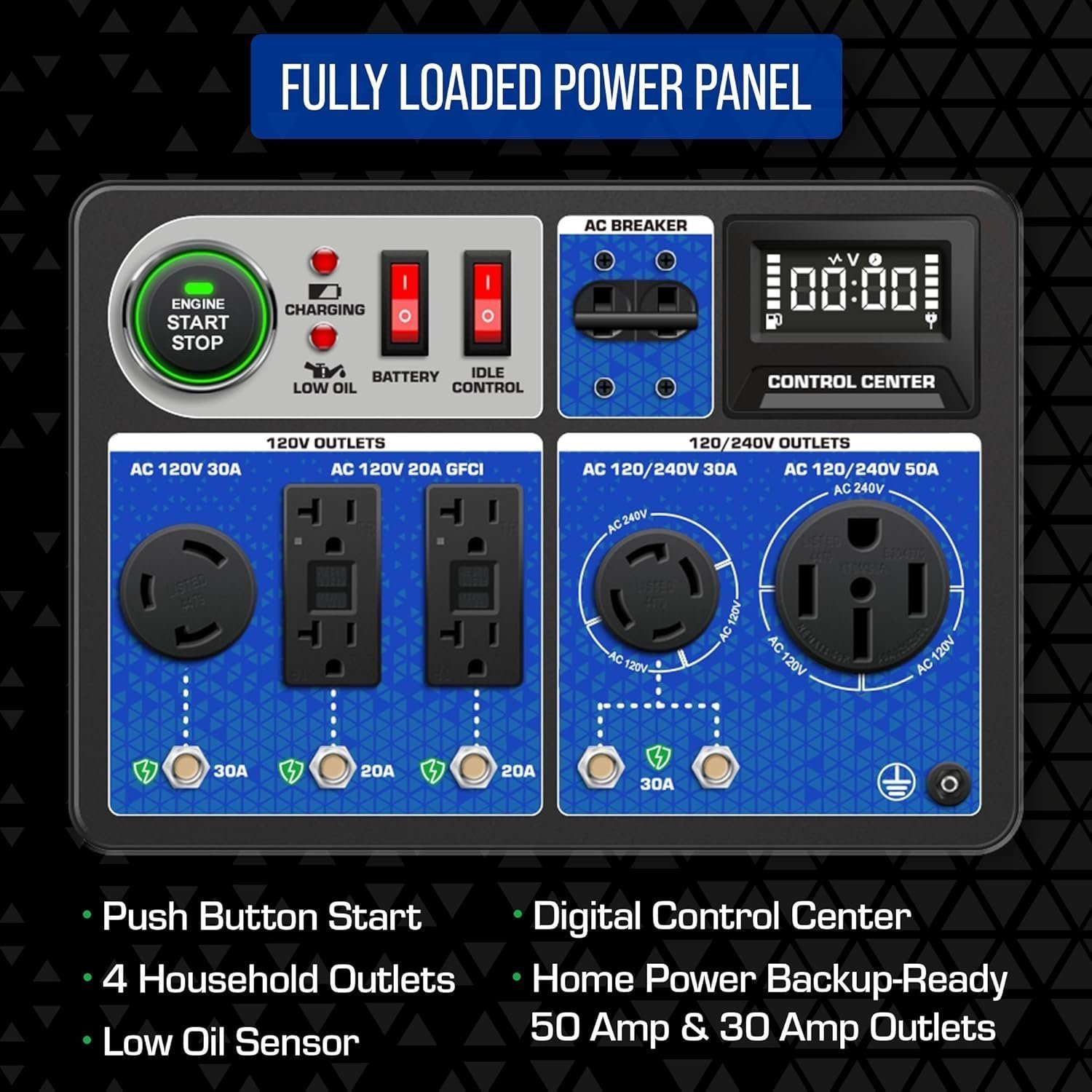 • The XP13000HXT comes with a push button start, a front facing interface that allows you to change your fuel type in seconds, and a wide variety of outlets including a transfer switch-ready 50 amp outlet