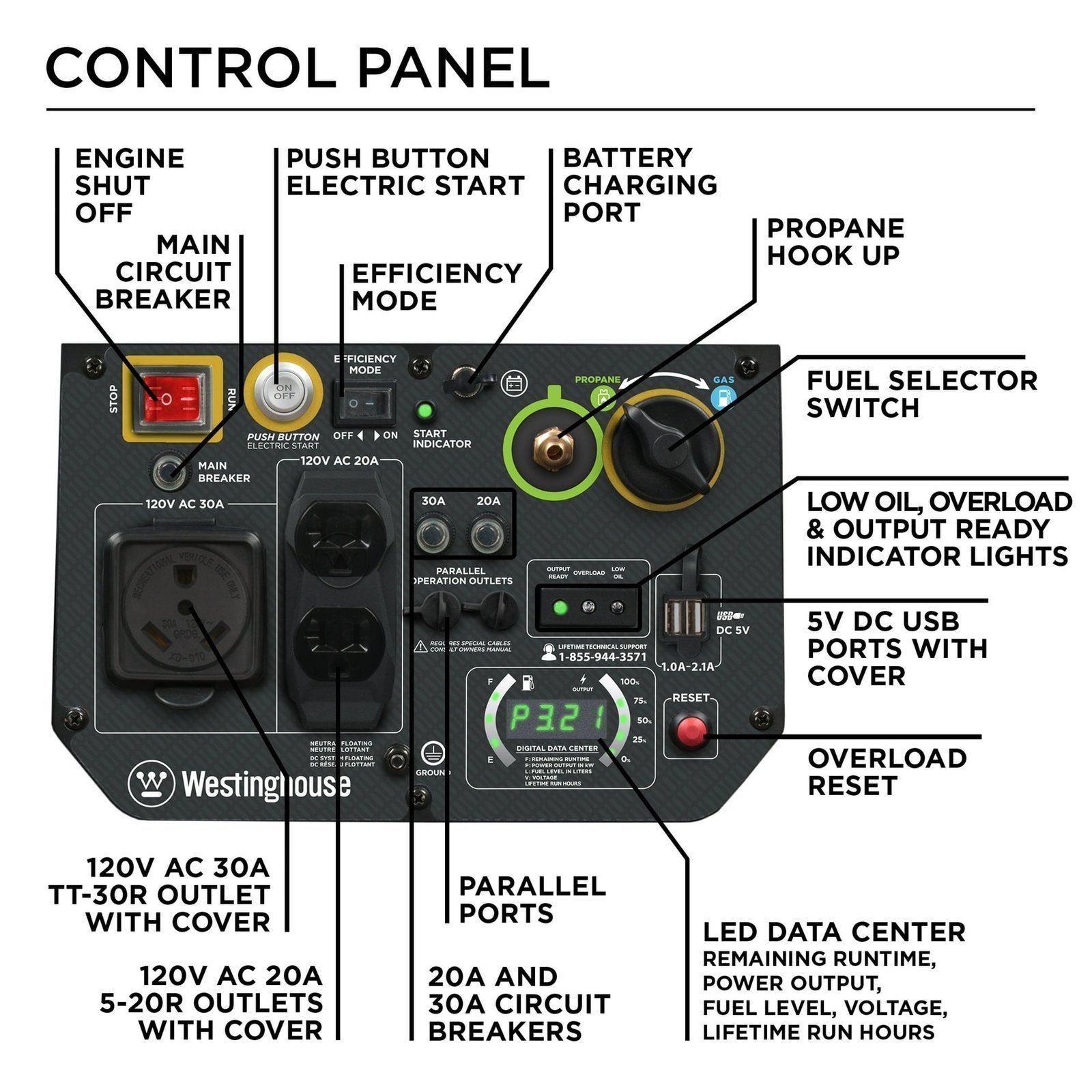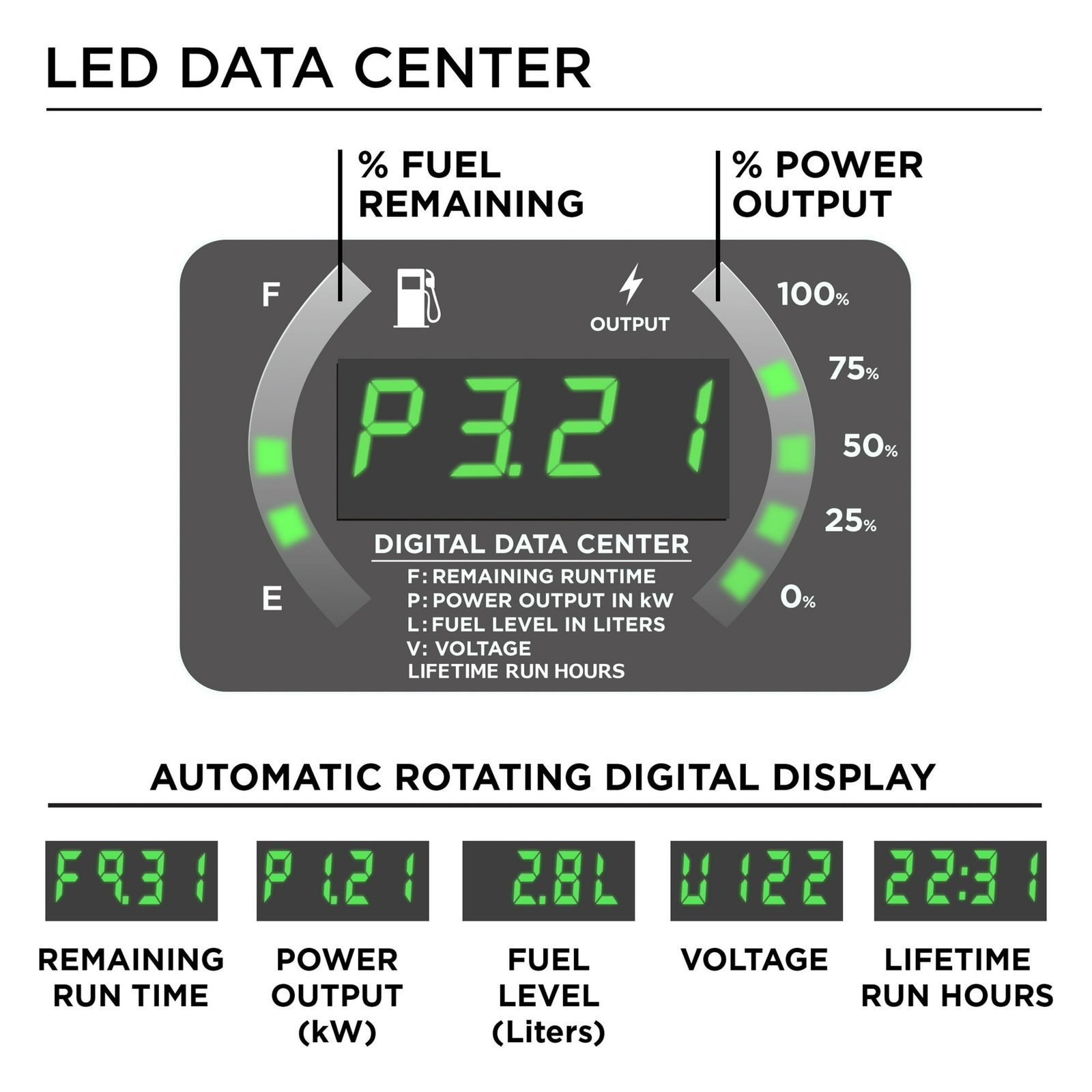 - Real-time LED display with runtime, remaining fuel, load/output, volts and lifetime hours data