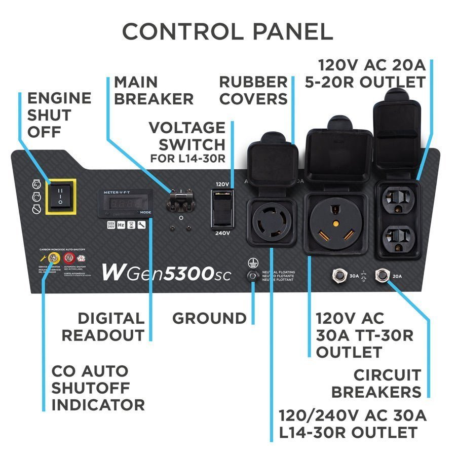 The Westinghouse WGen5300sc is a versatile solution for all your power needs from your home to your travel trailer when you’re looking for a dependable backup power supply. The WGen5300sc produces 6,600 peak watts and 5,300 running watts with a powerful 274cc 4-Stroke OHV Westinghouse Engine constructed for durability. Running for up to 14.5 hours on a 4.7 gal. (18L) tank of gas, it’s conveniently equipped with a built-in fuel gauge, automatic low oil shutdown, and electric start with manual choke. The L14-30R outlet is Transfer Switch Ready for total household power and eliminates the hassle for annoying extension cords or power strips. Combined with an RV Ready TT-30R outlet, all this generator needs is a one cord hookup to ensure your recreation vehicle or home is ready to go for air conditioners, refrigerators, sump pumps, and home necessities. The intuitive control panel includes the Digital Readout to share real-time updates on maintenance information, making it easy to care for the WGen5300sc with long life and lasting utility. Engineered into a compact hardened-steel frame with added roll bars, foam grip handle, and never-flat wheels, it lets you easily move this generator from storage to use. The WGen5300sc Portable Generator is complete with a 3-Year Limited Warranty and Lifetime Technical Support to ensure your confidence can be backed by our nationwide customer service and support network.